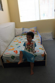 - 為了迎接小淘氣的到來,小子從cot搬到單人床去睡了。母子床有裝bed rail,但母床還是太高了,頭一個禮拜他從母床上掉下來兩次。後來把母床拆掉只剩子床,情況改善許多。