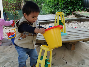 - 正在做Toilet Training,有一點點小成效。問他要不要去尿,時常回說"不要",只好變成不問他,直接跟他說"走,我們來去餵馬桶寶寶喝水",反而還比較有效。