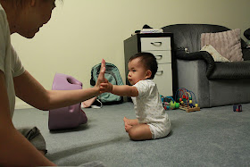 很會爬了,而且會故意沒聽見「不可以」。尤其我在做菜時,喜歡爬到廚房,只好再把他抓回客廳。
